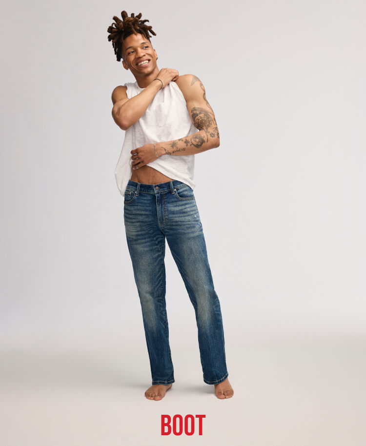 Some guys prefer their jeans to offer a bit more breathing room, so our men's athletic fit jeans and relaxed straight jeans provide more space in the hip and thigh without compromising on style. Our bootcut jean fits include low-rise styles that fit loose and are designed for athletic builds and mid-rise designs that sit at the hips and have an easy fit through the leg and thigh.